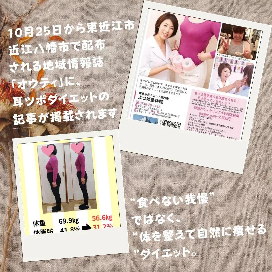 お知らせ耳つぼダイエット11月が始まりました🍁 2025年11月2日 11月号の東近江市・近江八幡市で配布される地域情報誌「オウティ」に、耳ツボダイエットの記事が掲載されます “食べない我慢”ではなく、 “体を整えて自然に痩せる”ダイエット。 「オウティ見たよ!」で 初回カウンセリング 【2,980円】キャンペーン実施中 秋は、体も心も整えるチャンスです🍁